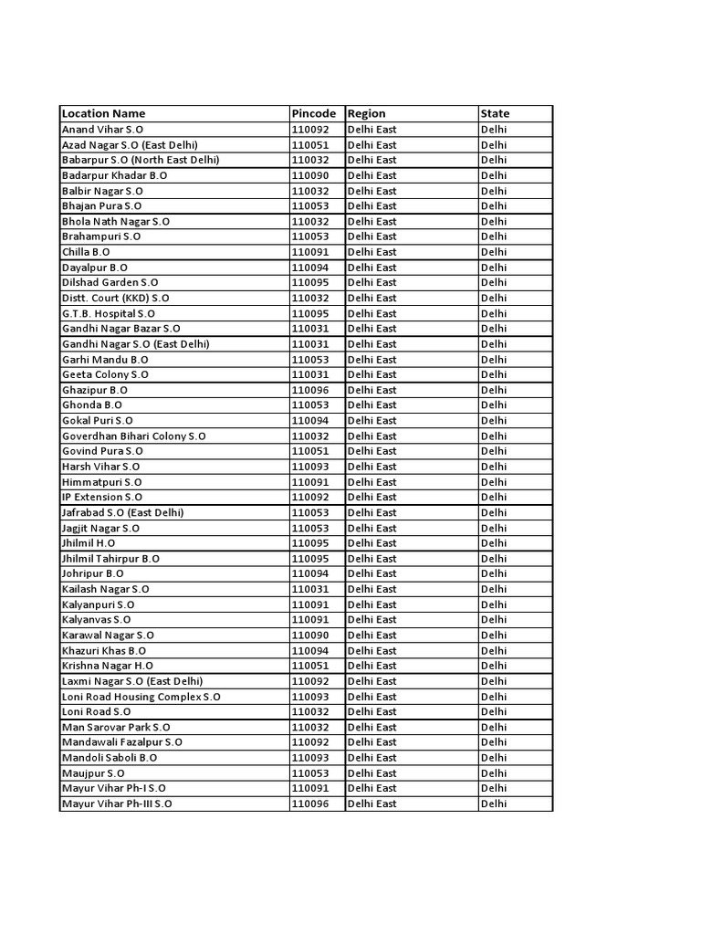 List Of Pin Codes Postal Code Of Delhi A B